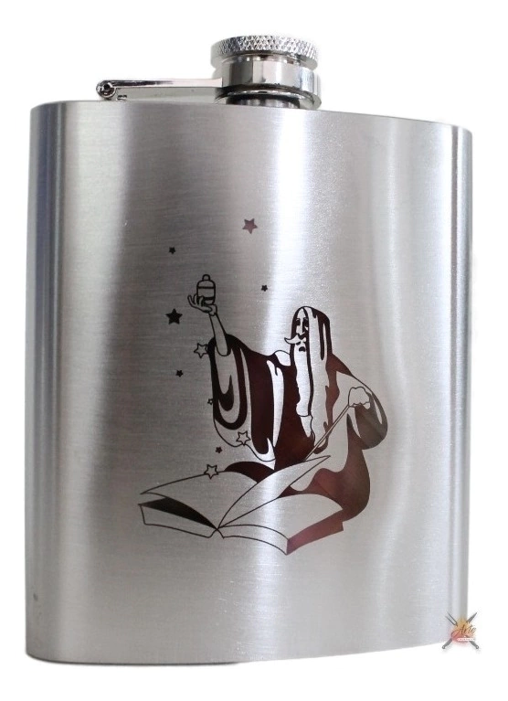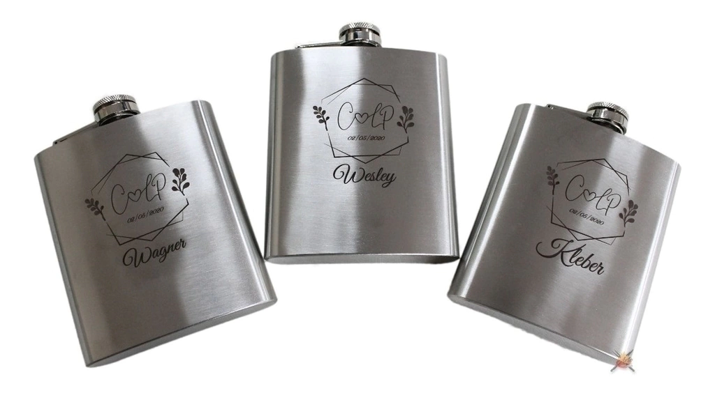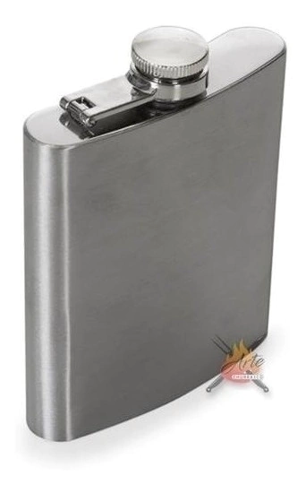 Porta whisky de inox com capacidade 7oz (200ml), tampa de rosca sustentada por suporte na lateral superior.
