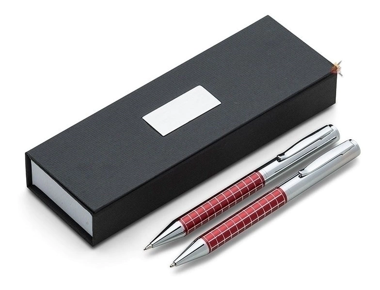Kit caneta e lapiseira de metal em estojo papelão com placa de metal (parte interna do estojo revestida com espuma). Caneta e lapiseira prata com detalhes coloridos e quadriculados, clip metal com anel superior na ponta e dois anéis centrais e acionam por giro.