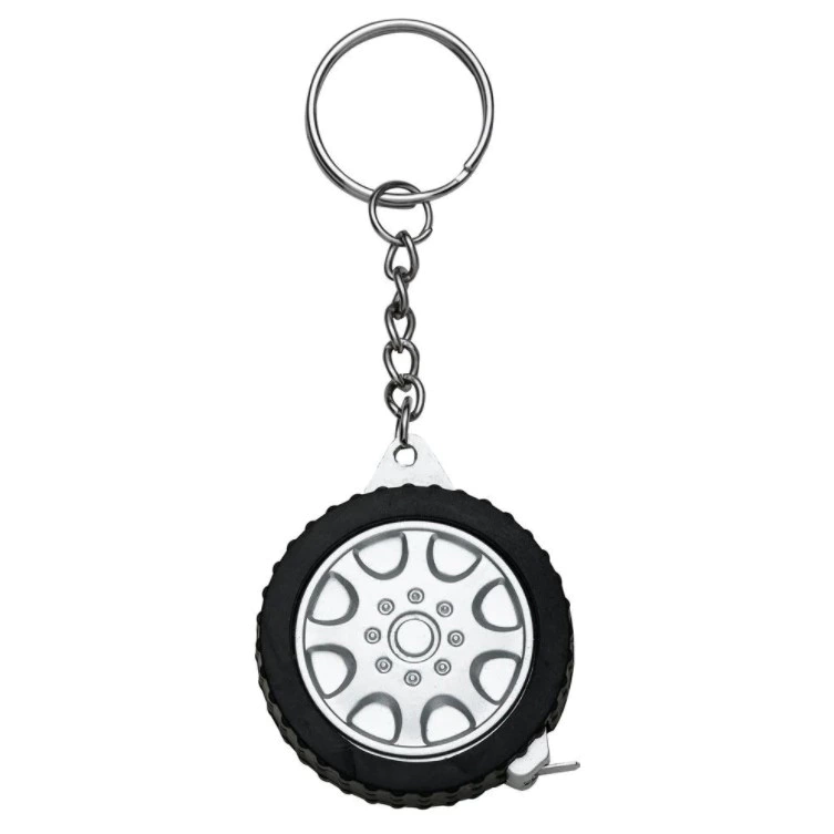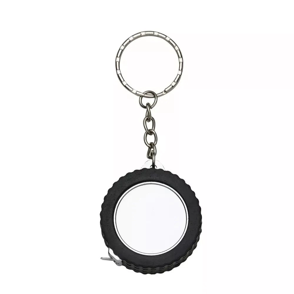 Chaveiro trena 1 metro formato pneu brilhante, material emborrachado com relevo. Detalhes do aro em plástico prata, verso liso. Trena não possui trava.