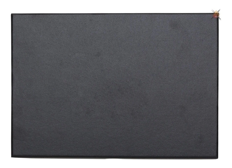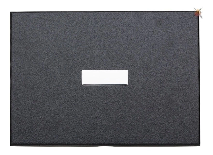 Kit executivo 3 peças em estojo de papelão com tampa e parte interna revestida de espuma. Contém: porta cartão de couro sintético texturizado com detalhes prata brilhante, caneta metal fosca com detalhe emborrachado preto, caderneta tipo moleskine em couro sintético com aproximadamente 80 folhas amarelas pautadas. Acompanha placa metálica para gravação.