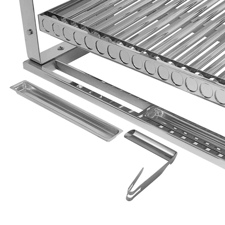 Reforçada, com ampla área. Múltiplos usos: para grelhar uma costela de boi, manter aquecidas carnes e legumes grelhados, apoio de espetos com carne, etc. É desmontável para limpeza.