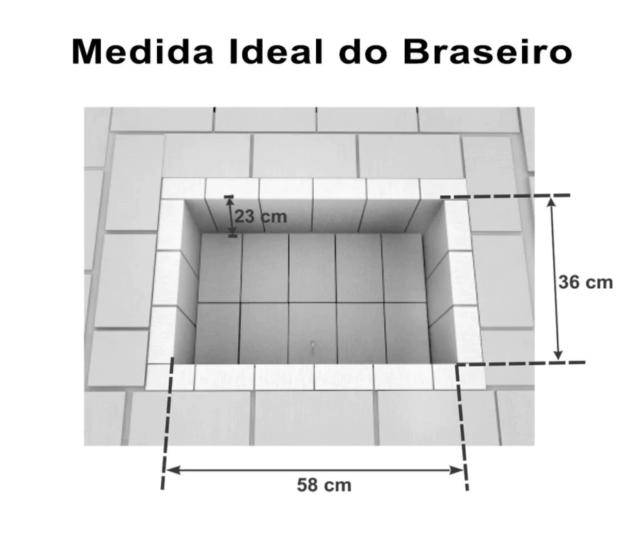 Medida Ideal do Braseiro: C 58,0 x L 36,0 P 22,0 cm.