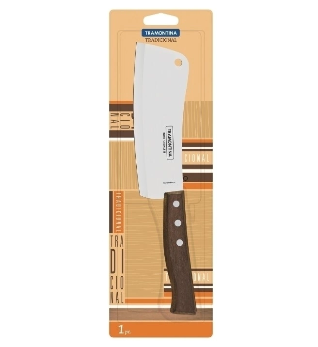 Com o Cutelo Tradicional com Lâmina em Aço Inox e Cabo em Madeira Natural 6 polegadas, você terá mais eficiência para quebrar e separar os ossos da carne. A peça apresenta um cabo de madeira natural com acabamento polido dando aquele toque rústico. Por ter sido produzido com lâmina em aço inox, o cutelo oferece maior durabilidade e resistência. Além disso, o design da peça combina com qualquer ambiente, deixando-o mais bonito e charmoso. CARACTERÍSTICAS Ideal para quebrar e separar os ossos. Lâmina de aço inox com maior durabilidade do fio devido ao tratamento térmico. Cabo da madeira natural. Rebites de alumínio. INFORMAÇÕES ADICIONAIS