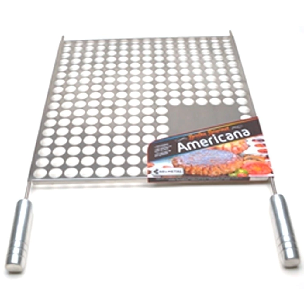 Grelha americana para churrasco é feita em aço inox 430, proporcionando maior durabilidade. Possui cabo em madeira revestido em alumínio e chapa de 1,2mm escovada. Permite duas opções de preparo: selar a carne ou hambúrguer na área de chapa lisa e assar outros cortes na área grelhada, por exemplo, oferecendo praticidade de uso.