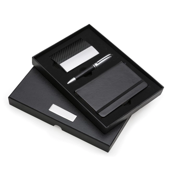 Kit executivo 3 peças em estojo de papelão com tampa e parte interna revestida de espuma. Contém: porta cartão de couro sintético texturizado com detalhes prata brilhante, caneta metal fosca com detalhe emborrachado preto, caderneta tipo moleskine em couro sintético com aproximadamente 80 folhas amarelas pautadas. Acompanha placa metálica para gravação.