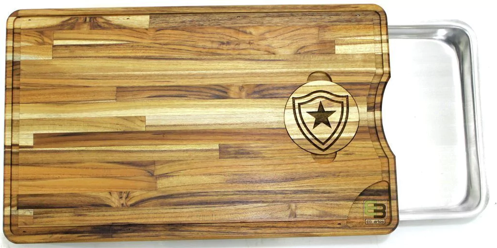 Tábua de corte com gaveta térmica. Esta tábua é feita em madeira TECA com fino acabamento e alta resistência, proporcionando durabilidade de longos anos.