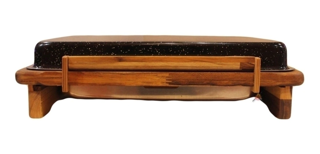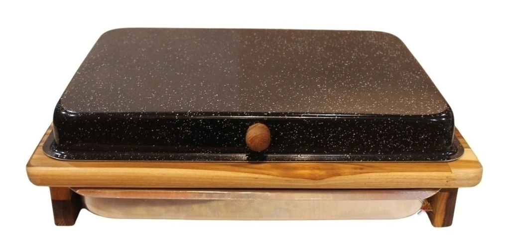 Possui uma tampa colorida e gaveta térmica* em alumínio para conservar a carne quente, livre de moscas e mosquitos.