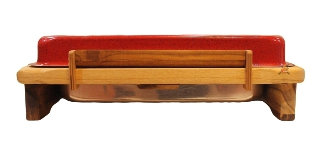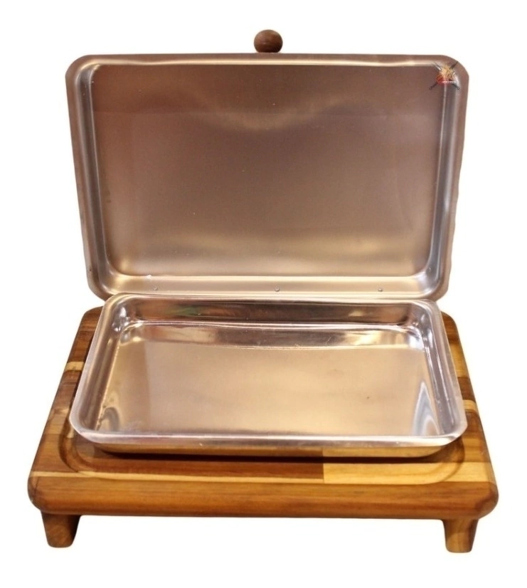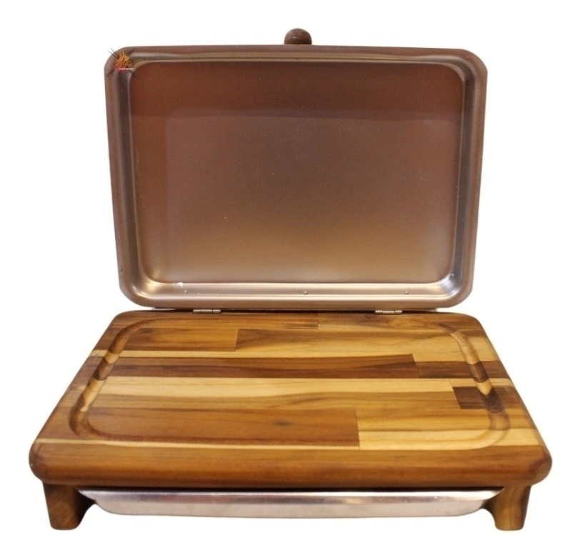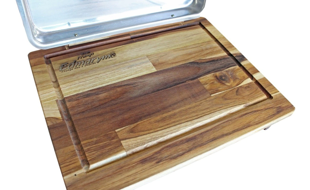 Feita com madeira Teca, utilizada em indústria naval, é resistente a cortes e não passa gosto no alimento.