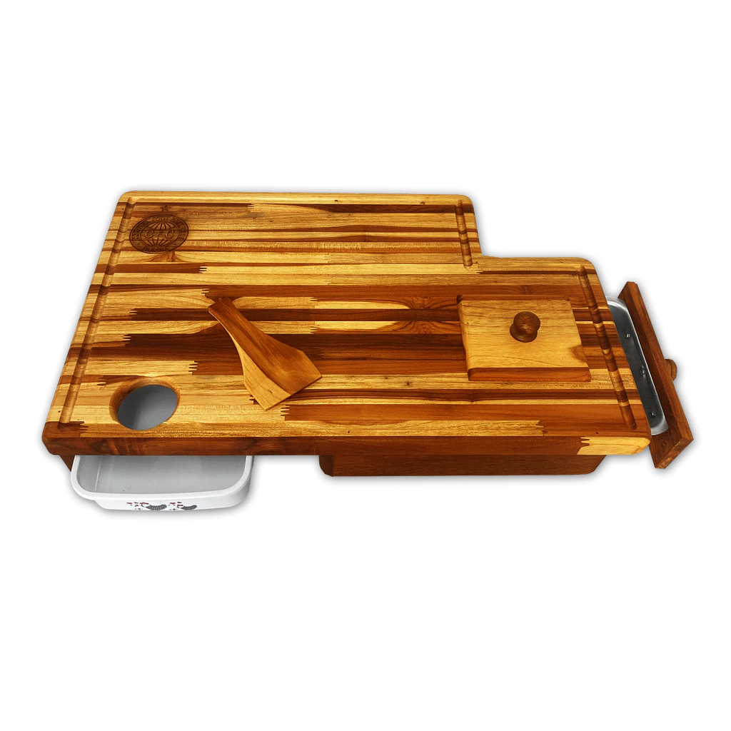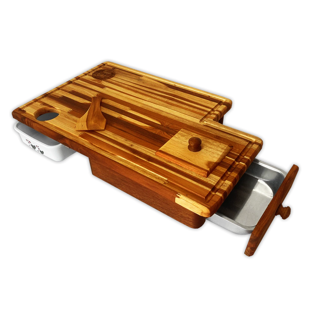 Na parte superior da tábua (área de corte) utilizamos a madeira TECA, atualmente a espécie tropical mais cultivada em reflorestamentos comerciais de diversos países do mundo. Trata-se de uma madeira nobre de grande durabilidade, super-resistente a cortes e que não passa gosto para os alimentos. A parte inferior também é montada com madeiras nobres de origem legal.