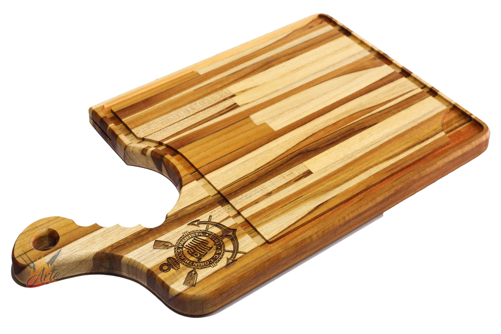 Esta tábua utiliza madeira TECA atualmente a espécie tropical mais cultivada em reflorestamentos comerciais de diversos países. Trata-se de uma madeira nobre de grande durabilidade, super-resistente a água e a cortes, também não passa gosto para os alimentos.